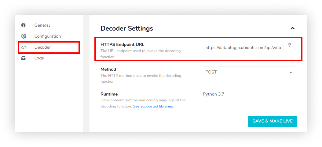 A public webhook plugin is an Ubidots-defined logic whose execution is triggered by making an HTTP request to its *HTTPS endpoint URL.*