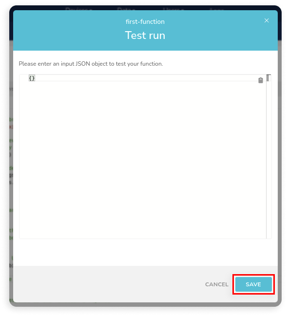 This will pop-up a modal in which you can input a JSON object for testing the UbiFunction. Upon clicking the *SAVE* button, the UbiFunction will be executed with the JSON object passed.&#x20;
